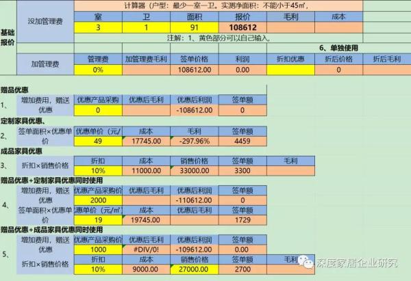 第三優(yōu)惠,優(yōu)惠計(jì)算不是簡(jiǎn)單的計(jì)算優(yōu)惠對(duì)毛利率影響的多少,而是利用戶型+面積的一房一價(jià)計(jì)價(jià)方式的,事前毛利率能夠清楚的算出的特性,設(shè)置不同級(jí)別的優(yōu)惠,同時(shí)根據(jù)精準(zhǔn)的毛利率計(jì)算的時(shí)效性,清楚設(shè)置出新的按最終盈利結(jié)果的績(jī)效方式,而以業(yè)績(jī)?yōu)榻Y(jié)果的績(jī)效方式天生就有問(wèn)題。采用戶型+面積的一房一價(jià)計(jì)價(jià)方式事前毛利率計(jì)算清楚,是我們現(xiàn)在所追求的阿米巴經(jīng)營(yíng),就非常容易實(shí)現(xiàn)。大家都知道導(dǎo)入阿米巴經(jīng)營(yíng),是需要花大價(jià)錢的,并且依靠系統(tǒng)支持,西安積木家是我所見(jiàn)到公司,這方面唯一一個(gè)做到的。而采用簽單前毛利率的精準(zhǔn)的特性,利用依靠恒定毛利率,在不改變現(xiàn)在按業(yè)績(jī)提成的績(jī)效的條件下,增加毛利率折業(yè)績(jī)或者超毛利分成,就可以實(shí)現(xiàn)營(yíng)銷人員從一個(gè)銷售人員到經(jīng)營(yíng)人員的轉(zhuǎn)變,并且不傷害原有的組織、制度和績(jī)效。(來(lái)源:深度家居企業(yè)研究)