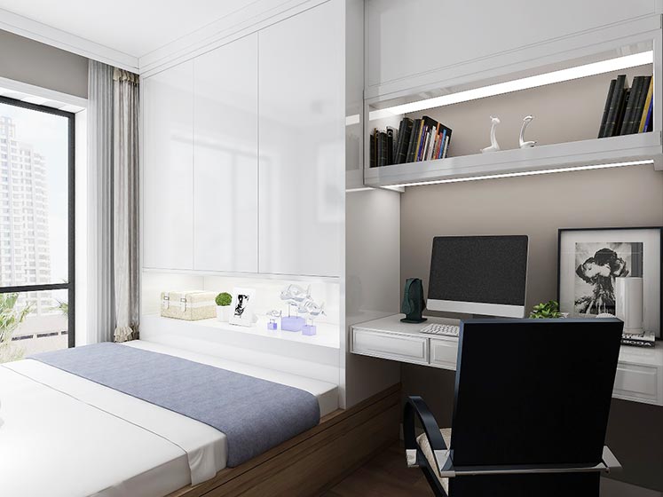 這是個簡約且時尚的小臥室,同樣的,這個小臥室也是整體榻榻米打造,從床到書桌再到衣柜全部是整體設(shè)計。