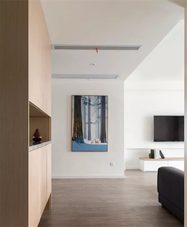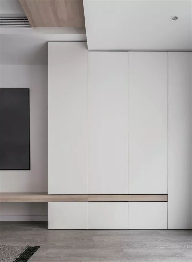 墻面不做過多裝飾,盡量保持干凈簡潔的面貌,巧妙地弱化其存在感。 如果你覺得家里太單調,也可以選擇用一個偏日系的亮色家具來點綴,讓空間充滿生氣。
